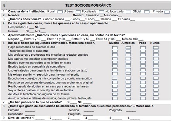 El diseño de la investigación abarcó dos instrumentos. El primero, un test sociodemográfico (Tabla 2) que sirvió para describir las características de los participantes en relación con el desarrollo de la competencia escritora, y el segundo, una rúbrica útil para evaluar las producciones narrativas de los grupos experimental y control.