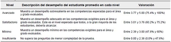 Conforme a los criterios del Instituto Colombiano para el Fomento de la Educación Superior (ICFES), se asumió los rangos de la prueba Saber con una escala de 0,0 a 5,0, con asignaciones entre insuficiente y avanzado, tal como lo muestra la Tabla 3.