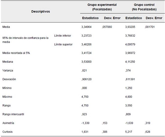 En cuanto a las técnicas estadísticas, se utilizó un análisis descriptivo de frecuencia de los porcentajes y un análisis descriptivo a partir de los indicadores de tendencia central: media, mediana, mínimo y máximo, y a través de los resultados del diagrama de cajas con el Rango intercuartílico RIC, el cual determinó el grado de homogeneidad entre los grupos.