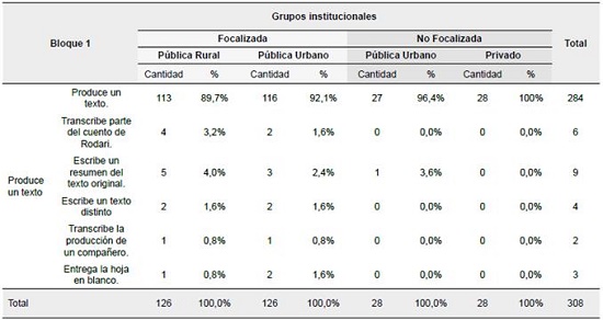 El tercero, es que los resultados muestran un margen diferencial entre los dos grupos, sostenido en los cinco bloques, demostrando la superioridad de la calidad narrativa de los colegios privados. Así, en el bloque uno (produce un texto original) se revelan competencias en los cuatro grupos intervenidos. La Tabla 5 muestra que los estudiantes de la zona rural cuentan con menores competencias para producir un texto narrativo escrito.