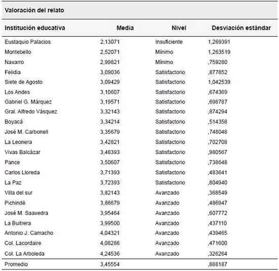 En general, en las respuestas al test sociodemográfico se apreciaron situaciones favorables para los grupos de las instituciones públicas, gracias a que se develó un interés de padres y maestros en proporcionar a los estudiantes experiencias, curriculares y extracurriculares, alrededor de la escritura. El test mostró que, a mayores oportunidades socioeconómicas y culturales, mejores competencias narrativas para el grupo control y a menores oportunidades, inferiores competencias para el experimental, ratificando las diferencias en los códigos de comunicación entre los escolares, relacionados con los códigos lingüísticos (Berstein, 1996).