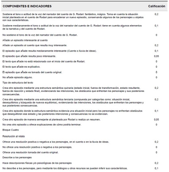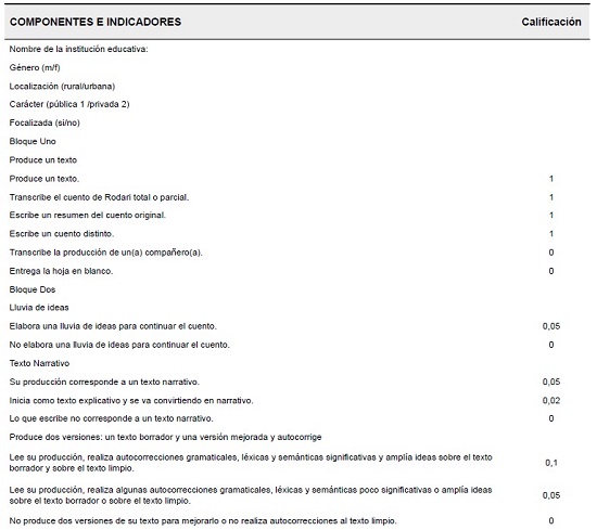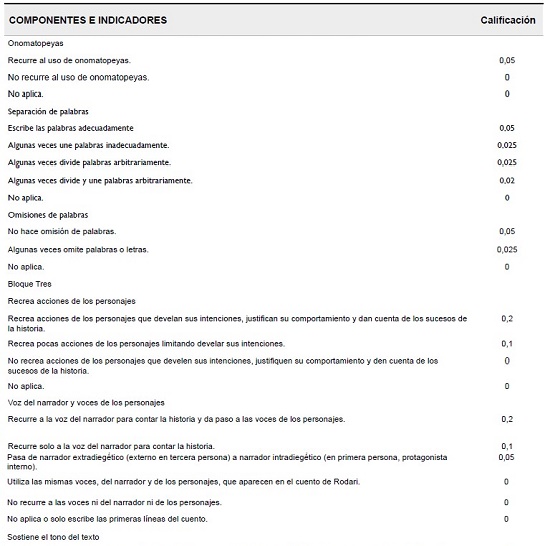 Las dos pruebas consistieron en narrar el final a dos cuentos: "Pinocho el astuto" y "El tamborilero mágico", ambos de Rodari (2012). En 2014, los relatos fueron evaluados mediante una rúbrica con indicadores organizados en cuatro bloques. El primero valoró las competencias en los recursos formales: elaborar una lluvia de ideas, un texto borrador y uno limpio tipo narrativo; y evaluó aspectos morfosintácticos. El segundo evaluó aspectos relacionados con la narración: recreación de las acciones y descripciones de los personajes, funciones y tono del narrador, intenciones, obstáculos, consecuencias que enfrentan los personajes, episodio añadido y tipo de estructura del cuento. El tercero midió: la resolución -positiva o negativa-ofrecida a las acciones de los personajes, si son descritos -física y psicológicamente-, y las marcas de tiempo y espacio usadas para el relato.Y en el cuarto se evaluaron: la macroestructura, la verosimilitud, la intertextualidad y si el estudiante se adecuaba a la consigna.