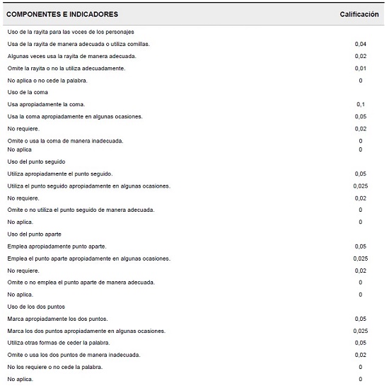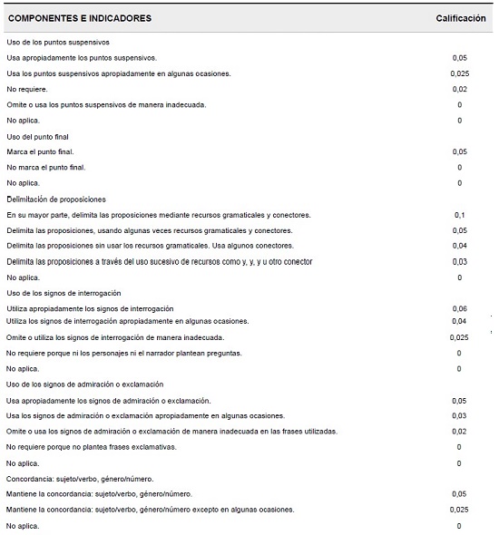 Se consideró relevante evaluar las mismas competencias de la primera intervención, en 2014, organizadas esta vez en cinco bloques, dado que se añadió uno que valora si el estudiante produce un texto original, no una copia, no un resumen. De esta manera, la rúbrica, compuesta por 31 componentes, se subdivide a su vez en diferentes indicadores: el primero destaca la mayor competencia alcanzada; en el centro, indicadores que evidencian la competencia medianamente lograda; y el último indicador (negativo) señala su ausencia. Su validez está favorecida gracias a que fue ensayada por el MEN (1998) (Ver anexo 1).
