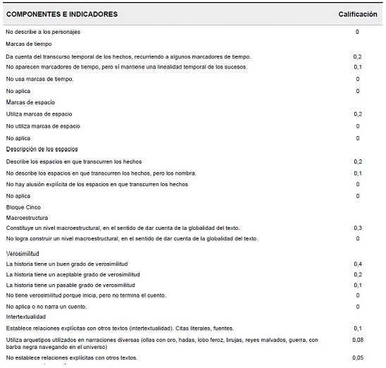 Para evaluar las producciones narrativas escritas se tuvieron presentes los trabajos de Avilés (2015), Sotomayor, Ávila y Jéldrez (2015), la UNESCO y la OREALC (2016) sobre rúbricas, adecuando una rejilla que identifica las competencias de los estudiantes, mediante indicadores de escritura que valoran el texto en su conjunto (MEN, 1998). Esto posibilitó el análisis de las unidades locales en relación con el todo, revisar la organización, el orden y la conformación del texto, y si se ajustaba o no a la estructura de una narración ternaria o quinaria, esta última considerada por Cortés y Bautista (1999) con mayor posibilidad para generar historias más complejas.