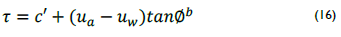 Cuando el material no se encuentra saturado y el esfuerzo normal es cero la resistencia al esfuerzo cortante es la suma de la cohesión en condición saturada (c ') más la cohesión aparente debida al aumento de la succión, de esta forma la Ecuación 15 se puede expresar como: