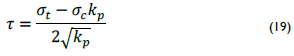 De esta forma en cada pastilla se conoce la succión matricial obtenida por el método de papel filtro, del ensayo de corte directo en condición consolidada drenada se conoce la cohesión efectiva (c ' ) y el ángulo de fricción efectivo (Ø') en la condición saturada, y del ensayo de tracción indirecta se determina (σt) y σc ), reemplazado en la Ecuación 17 y 19, se tiene para cada condición de succión la resistencia al esfuerzo cortante y por tanto la envolvente de resistencia al corte extendida (Valencia et al., 2019).