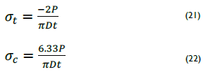 Según la propuesta de Valencia et al., 2019, el esfuerzo a tracción (σt) y compresión (σc ), se obtienen a partir de las Ecuaciones 21 y 22 con los resultados del ensayo de tracción indirecta, donde: