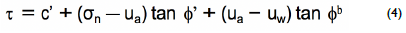 Posteriormente Fredlund, Morgenstern y Widger (1978), presentan la Ecuación 4 con tres variables independientes, que es la base para muchas ecuaciones empíricas de resistencia al corte, fundamentada en el criterio de falla de Mohr-Coulomb y que se conoce como forma extendida de Fredlund, ya que agrega un término a la expresión que depende de la succión, como se muestra a continuación: