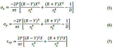 Para el diámetro horizontal del cilindro, es decir sobre el eje X, Y = 0, r1 = r2 = X2 + R2, las ecuaciones de esfuerzos se simplifican a las Ecuaciones 8, 9 y 10:
