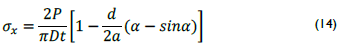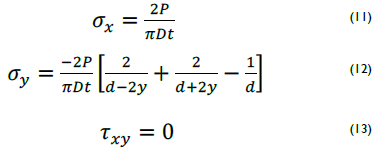 El esfuerzo vertical σy a lo largo del eje X, es siempre de compresión y varía de máximo en el centro a cero en el perímetro de la circunferencia como lo muestra la Figura 2, en el centro la magnitud de σy , es igual a -6P/ϖDt y el valor de σx que es un esfuerzo de tensión, es igual a 2P/ϖDt.