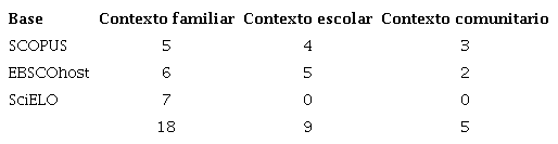 Fueron 32 artículos los que cumplieron con los criterios para ser incluidos en la revisión y análisis. En la Tabla 1 se aprecia el desglose del número de artículos incluidos por base y por contexto. Inicialmente se presenta lo obtenido para el contexto familiar, después para el escolar y finalmente para el contexto de la comunidad en párrafos por artículo según como sugiere el método PRISMA.