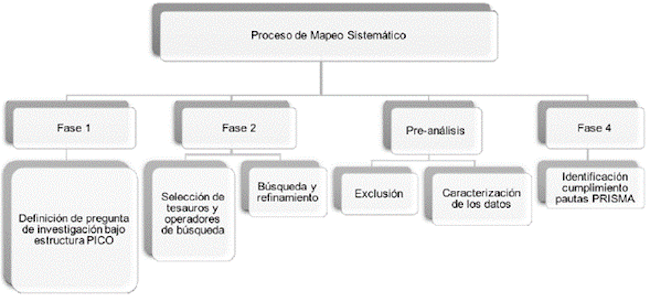 De este modo, la metodología investigativa implementada corresponde al desarrollo de un mapeo sistemático, ilustrado en la Figura 1. Este esquema representa una síntesis de la primera fase de una Revisión Sistemática de Literatura, la cual comprende el establecimiento de una estrategia de búsqueda y selección (Navarro y Ramírez, 2018).