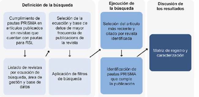 Así pues, el esquema metodológico responde a una búsqueda sistemática de literatura de enfoque exploratorio comprendido por 3 fases: 1) selección del estándar internacional de publicación para la posterior comparación de resultados; 2) búsqueda sistemática de revistas que publican RSL en administración, y 3) comparación de pautas de publicación entre el estándar internacional seleccionado y las revistas. Las fases de identificación del estándar de comparación y de selección y extracción de revistas, se realizaron paralelamente.