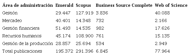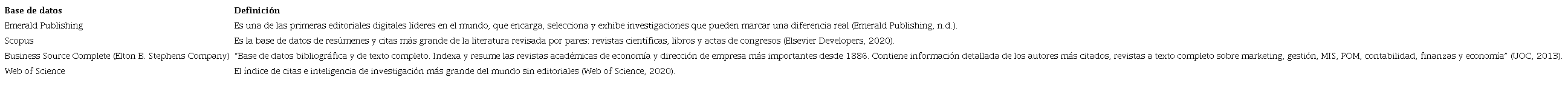 En el presente estudio, se hace referencia a cuatro bases de datos, tal como se evidencia en la Tabla 1, Emerald, Scopus, Business Source Complete (EBSCO) y Web of Science (WOS) son bases que permiten obtener información bibliográfica y/o textos completos de miles de publicaciones, "al igual que información bibliométrica y cienciométrica que ayudan a analizar y estudiar la producción editorial académica y científica-investigativa" (UPTC, n.d.).