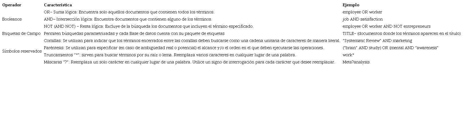 En la Tabla 2 se presentan los operadores de búsqueda implementados para facilitar la búsqueda y guiar las ecuaciones para encontrar los documentos que se relacionen directamente con el tema de investigación, en este estudio en específico se usaron tres tipos de operadores.