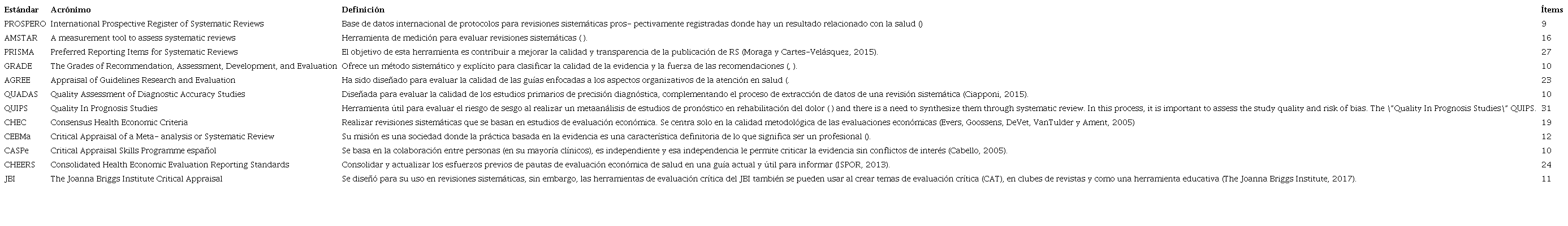 En principio, al determinar pautas para analizar, comparar y evaluar la información obtenida una vez realizada la búsqueda sistemática de las revistas y artículos relativos a RSL, se realiza una investigación exploratoria de estándares de revisión internacionales. Lo anterior con el fin de determinar cuáles son los que tienen una mayor representatividad en el ámbito editorial, además de cuáles son los más comúnmente usados en el área de gestión. En este sentido, se seleccionaron los siguientes trece estándares internacionales para su respectiva evaluación: PROSPERO, PRISMA, AMSTAR, AMSTAR II, GRADE, AGREE-II, QUADAS 2, QUIPS, CHEC, CEMBA, CASPE, CHEERS y JBI.