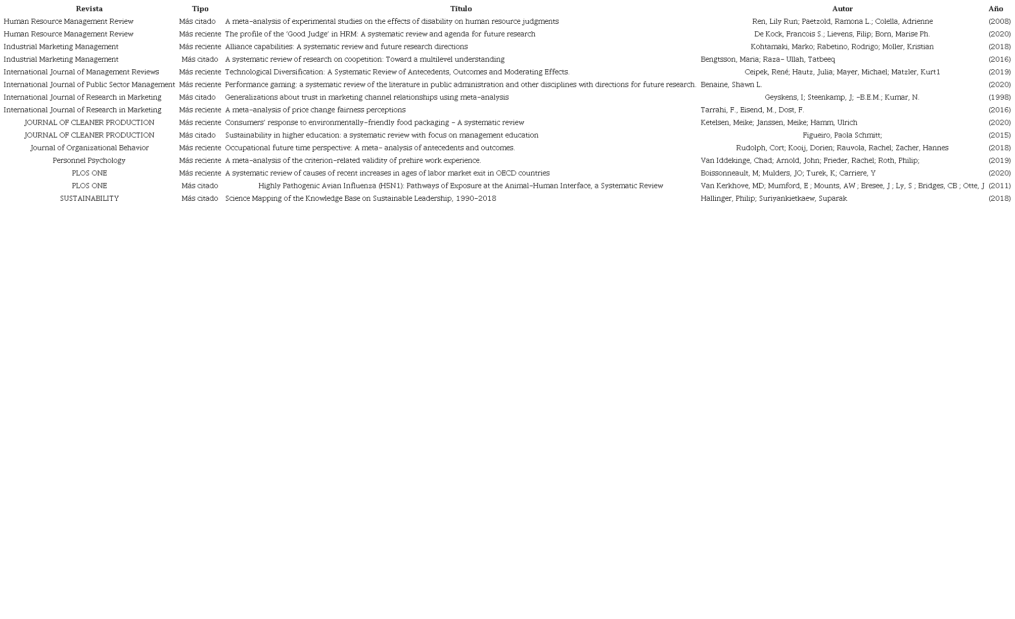 En la Tabla 8 se muestran los 16 artículos seleccionados siguiendo el esquema de mapeo sistemático para la identificación y comparación de publicaciones presentes en revistas que cuentan con pautas para autores relativas a RSL. Además, se enuncia en la descripción el nombre la revista de la cual se obtuvo la revisión, el autor y el año de publicación. Cabe resaltar que, para algunas revistas, las publicaciones más recientes coinciden con las más citadas, implementando las ecuaciones de búsqueda propuestas, por tanto, se observan revistas que cuentan con un solo artículo para el análisis.