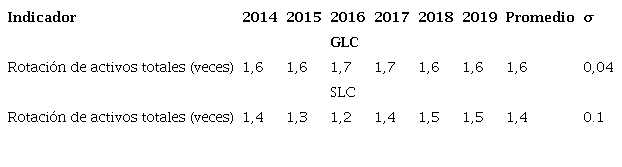 La rotación de activos permaneció constante en los dos primeros y dos últimos años del período con un índice de 1,6 veces, y solo para el bienio 2016-2017 aumentó a 1,7 veces, lo que dejó un promedio de eficiencia en el uso de los activos de 1,6 veces al año en el sexenio evaluado (parte b de la Tabla 2).