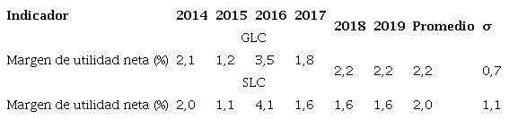 El margen de utilidad neta promedio en el sexenio del SLC (2,0%) fue inferior a la del GLC (2,2%), esta desventaja se mantuvo en casi todos los años, salvo en el 2016, y a pesar de que en ambos grupos este indicador de eficacia osciló en varios años, en la GLC se tuvo una mayor estabilidad (σ = 0,7%) que en el SLC (σ = 1,1%). Los márgenes netos fueron positivos todos los años (Tabla 12). Con esto se puede deducir que la gran empresa promedio de elaboración de productos lácteos es más eficaz y estable en el control de costos y gastos que todo el sector.