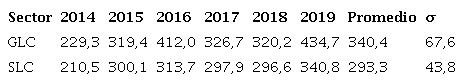 El apalancamiento financiero promedio del SLC (293,3%) fue menor que la de la GLC (340,4%); esta inferioridad se replica en todos los años, con la misma tendencia cambiante de orientación cada bienio, pero con una menor variabilidad en todo el sector (σ = 43,8% versus una σ = 67,6% en la GLC); lo que permite inferir que el SLC utilizó una proporción de deuda más baja y estable en comparación con la GLC (Tabla 13).