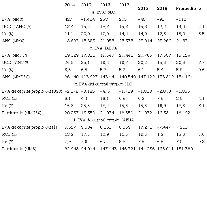 El EVA total del SLC fue positivo en tres años y negativo en los otros tres, mientras que en la IAEUA fue positivo en todos los años , no obstante, sus orientaciones no fueron semejantes en tres años. Al revisar sus inductores se encontró que el promedio del rendimiento después de impuestos del activo neto operacional fue inferior en el SLC (14,4%) en relación con la IAEUA (20,8%), como, también que el promedio del costo de capital fue superior en el SLC (15,0%) en comparación con la IAEUA (5,9%), dando como resultado un porcentaje de pérdida residual en el SLC (-0,6%) y un porcentaje de utilidad residual en la IAEUA (14,9%). (Ver partes a. y b. de la Tabla 15).