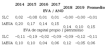 Además, el SLC destruyó EVA del capital propio en todos los años porque el costo de oportunidad de sus propietarios estuvo por debajo del rendimiento del capital propio, contrario a lo que sucedió en la IAEUA, donde este rendimiento supera lo requerido por sus dueños en los primeros cinco años de sexenio evaluado.