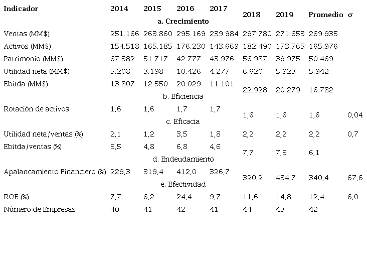 En la Tabla 2 se han calculado y clasificado los indicadores de desempeño financiero para un promedio de 42 empresas más grandes del sector elaboración de productos lácteos en Colombia (GLC) en el período 2014-2019, que anualmente reporta la Revista Dinero en una edición especial denominada "ranking de las cinco mil empresas más grandes de Colombia".