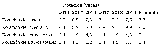 La rotación de cartera tuvo altibajos y solo en el bienio i 2016-2017 sostuvo un crecimiento, llegando un promedio i de rotación de 7,3 veces al año, donde la mayor eficiencia i en la gestión de cartera se presentó en el 2017 (7,9 veces) y la menor eficiencia en el año 2015 (6,5 veces). Mientras la rotación de inventario varió hasta 2016, donde la eficiencia de su administración fue menor (8,0 veces), pero después aumentó hasta lograr su mayor eficiencia en el 2019 con una | rotación de 9,9 veces; esto dejó un promedio de rotación de i 8,9 veces. Entretanto la rotación de activos fijos disminuyó durante el período, pasando de la mayor eficiencia de la administración de estos recursos, que rotaba 6,4 veces al año en el 2014 a una menor eficiencia en el 2019 con un índice de 4,3 veces al año, y solo un aumento en el 2018 interrumpió esta tendencia; los activos fijos rotaron en ' promedio 5,0 veces al año. En cambio, la rotación de activos totales descendió hasta el 2016 reportando su mayor ineficiencia (1,2 veces al año), pero posteriormente se elevó 1 hasta 1,5 veces al año en el bienio 2018-2019 donde mostró su mejor eficiencia; su promedio de rotación fue de 1,4 veces al año (Tabla 5).