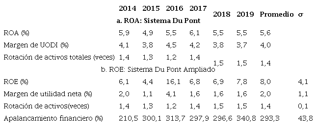 El ROA promedio del sexenio fue de 5,6%, que resultó del producto del margen de la utilidad operacional después de impuestos (4,0%) y la rotación de activos totales (1,4 veces). El ROA cayó en el 2015, convirtiéndose en el indicador de efectividad más bajo del sexenio (4,9%), luego subió en los dos años siguientes hasta llegar a su mayor efectividad en el 2017 (6,1%), pero el 2018 volvió a reducirse a 5,5% y permanecer así hasta el 2019; este indicador fue positivo en todos los años, y su orientación combina la tendencia del margen de utilidad operacional después de impuestos y la rotación de activos totales (Tabla 7).
