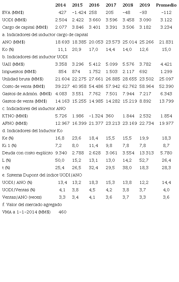 La creación de valor en cada uno de los años se puede ver en términos absolutos al comprobar que la UODI fue superior al cargo de capital, y en términos relativos al verificar que el indicador UODI/ANO fue superior al Ko, generando un porcentaje promedio de utilidad residual de I 14,9% en el período (20,8% menos 5,9%).