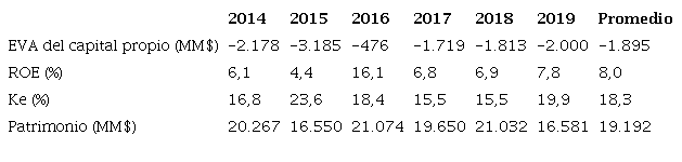 El EVA del capital propio fue positivo en los cinco primeros años, y negativo en el último año del sexenio, dejando como promedio un valor de $7.213 MMUS; su comportamiento cambió al pasar de reducirse en el lapso 2014-2016, a incrementarse en bienio 2017-2018, y derrumbarse de nuevo en el 2019; con una afinidad con la tendencia del ROE, pero diferente con la orientación del patrimonio.