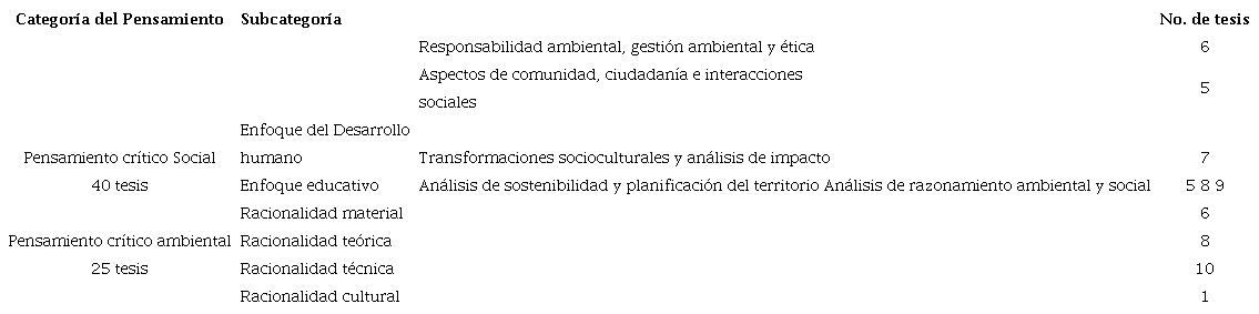 Los estudios ubicados en la categoría pensamiento crítico social se clasificaron en dos subcategorías: la primera, con enfoque del desarrollo humano (31 documentos) de estos 8 tesis sobre el análisis del relacionamiento ambiental y social, 7 tesis son relacionadas con transformaciones socioculturales y análisis de impacto, responsabilidad ambiental, gestión ambiental y ética; 6 tesis tratan la responsabilidad ambiental, gestión ambiental y ética; 5 tesis con aspectos de comunidad, ciudadanía e interacciones sociales, 5 tesis sobre el análisis de sostenibilidad y planificación del territorio. La segunda subcategoría se clasificó con enfoque educativo (9 documentos).