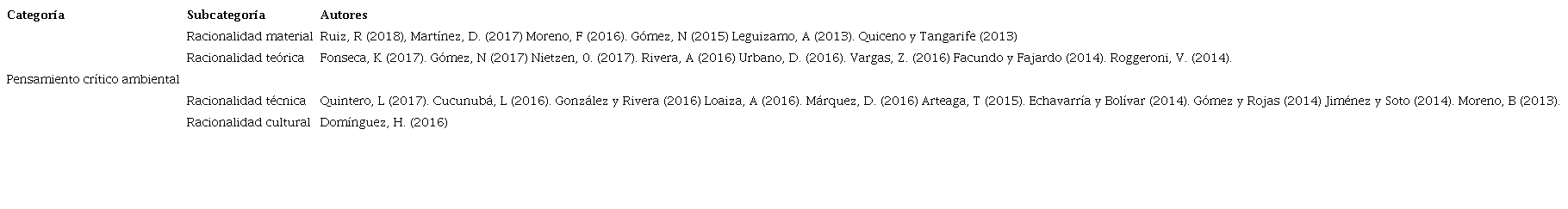 Ahora, los estudios ubicados en la categoría pensamiento crítico ambiental se organizaron en 4 subcategorizaron correspondientes a las racionalidades planteadas por Leff, así: racionalidad material con 6 tesis, racionalidad teórica con 8 tesis, racionalidad técnica con 10 tesis y racionalidad cultural con 1 tesis, como se evidencia en la Tabla 1.