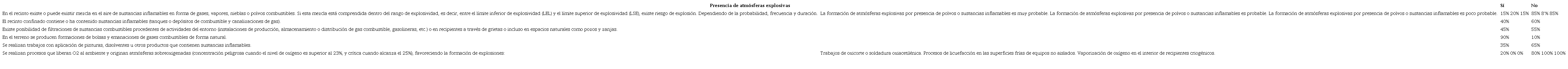 El apartado 2.2 del cuestionario del INSHT permitió recopilar información sobre la exposición a atmósferas explosivas. Allí se definen aspectos como la presencia en el aire de sustancias inflamables en forma de gases, vapores, nieblas o polvos combustibles; la existencia de depósitos de combustible y canalizaciones de gas; la producción en el terreno de formaciones de bolsas y emanaciones de gases combustibles de forma natural; el uso de disolventes u otros productos que contienen sustancias inflamables y procesos que liberan oxígeno (O2) al ambiente generando atmósferas sobre-oxigenadas.