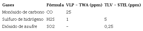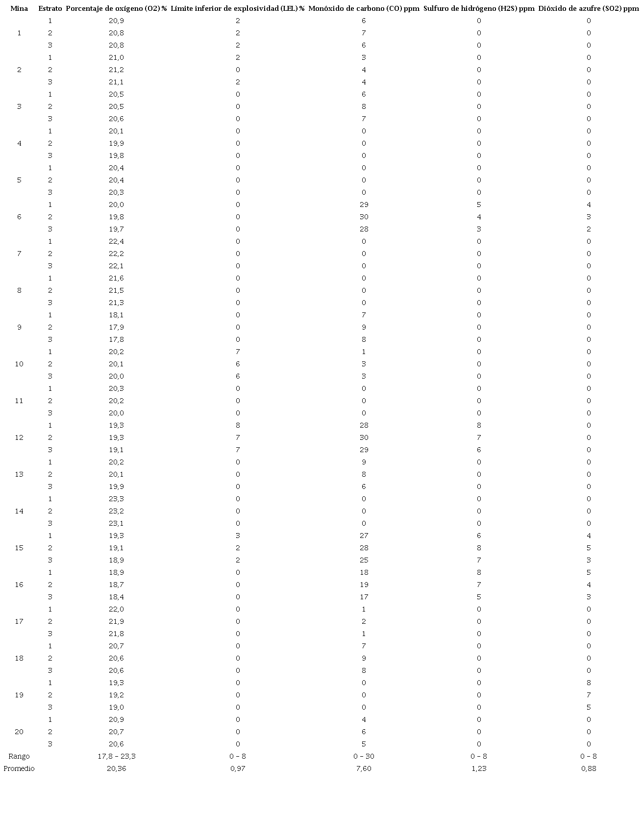 De acuerdo con resultados presentados en la Tabla 4, se encuentra que el 25% de las minas tiene niveles de oxígeno inferiores al 19,5% y ninguna supera el límite inferior de explosividad. Teniendo en cuenta que los mineros trabajan ocho horas diarias, se evidencia que en el 15% de las minas se supera el Valor Límite Permisible (VLP) de monóxido de carbono, en el 20% se supera el VLP de sulfuro de hidrógeno y en el 20% se supera el VLP de dióxido de azufre, incluso para un corto tiempo de exposición o STEL.