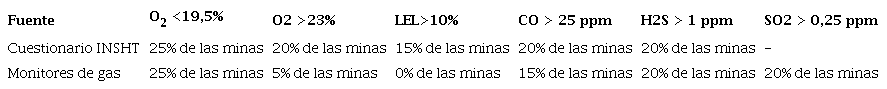 De acuerdo con la Tabla 5, se encuentra que los resultados del cuestionario del INSHT sobre el porcentaje de minas con niveles de O2 inferior a 19,5%, CO superior a 25 ppm y H2S superior a 1 ppm en el aire son validados por las mediciones de gases con monitores que se realizaron en las minas. Por otro lado, se presenta una diferencia en el porcentaje de minas que tienen niveles de O2 superiores al 23% y LEL superior al 10%. Estas diferencias se pudieron presentar porque la recolección de la información con el cuestionario del INSHT y los monitores de gas se realizó con dos meses de diferencia.