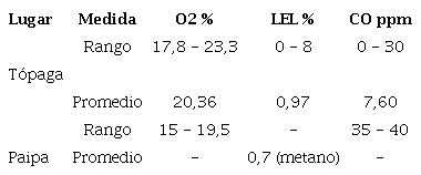 Posteriormente, se realizó una comparación con los resultados de un estudio presentado por Vega en 2001 (citado por Ospina, Manrique y Guío, 2010), quien hizo mediciones de gases en las minas de carbón de El Salitre en Paipa. En la Tabla 6 se presenta un comparativo de las mediciones de O2, LEL y CO de las minas de Paipa, en relación con las mediciones del presente estudio. Es importante señalar que Paipa y Tópaga son municipios del departamento de Boyacá.