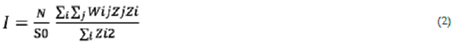 Donde N es el total de observaciones, el término S0=ΣiΣjWij representa la suma de los elementos espaciales de la matriz. El termino