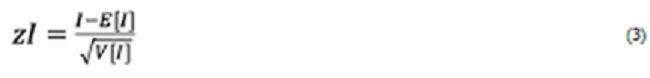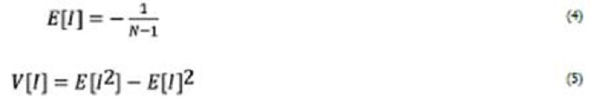 La ecuación 4 es conocida como el valor esperado del estadístico I de Moran y la ecuación 5 hace referencia a la varianza de este. El cálculo del estadístico Zi permite conocer si el índice de Moran estimado es estadísticamente significativo. Para ello se establecen las siguientes hipótesis: