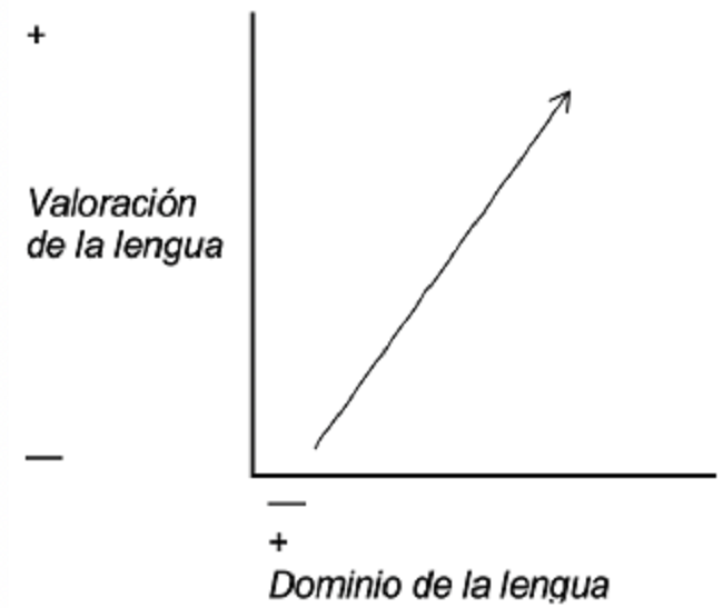 Para este estudiante una lengua se puede considerar como materna según el nivel de dominio del hablante. En este sentido, como el enunciador considera que conoce y habla perfectamente el español y el wayuunaiki, êl los valora con el mismo grado de pertenencia, configurando una tensión afectiva de correlación directa: dominio (o competencia lingüística) versus valoración de la lengua e importancia de la misma. Esto se podría esquematizar como se observa en la Figura 2.