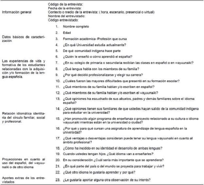 Dado el aspecto y la naturaleza cultural, educativa y étnica del interés investigativo, se acogió un enfoque metodológico cualitativo-interpretativo desde la semiótica del discurso que permitió el análisis de los datos. Para la recolección de la información se aplicaron entrevistas en profundidad a l0 estudiantes indígenas wayuu que residieron en el área metropolitana de Bucaramanga entre los anos 2011-2020. Dicho instrumento se disenó atendiendo a una serie de preguntas establecidas, sin desconocer la posibilidad de flexibilizar o modificar el cuestionamiento según los datos que iban emergiendo en el proceso de enunciación de cada participante. A continuación se relaciona el instrumento estándar aplicado: