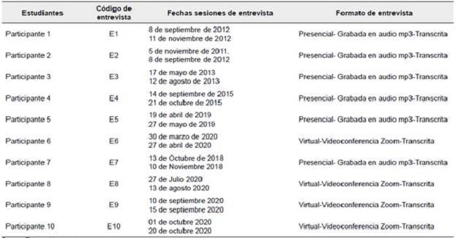 Las entrevistas fueron programadas en diferentes momentos según la disponibilidad de los participantes y según circunstancias sociales. En el caso de entrevistas presenciales, se desarrollaron en lugares acordados previamente dentro de las instituciones universitarias donde los estudiantes cursaban sus carreras profesionales. En el caso de las entrevistas realizadas en el ano 2020, como se estaba en un marco nacional de pandemia por el Covid-19, se aplicaron en formato virtual por medio de la herramienta gratuita de videoconferencias llamada Zoom. En la Tabla 2, se relacionan las fechas de los encuentros con el código identificador de cada participante y el formato de la entrevista.