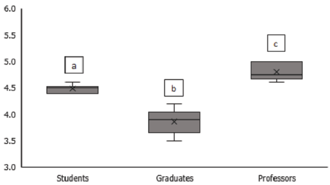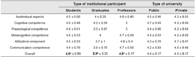 The information was analyzed with a comparative-descriptive approach to identify significant differences in the mean values for each category of questions related to gender, type of university (public/private), type of participant and others. Excel and SPSS 19.0 were used for this purpose, and the Mann-Whitney and Kruskall-Wallis nonparametric tests (Dexter, 2013; Sawilowsky and Fahoome, 2014). Tukey's HSD was employed with a significance level of P=0.05 (Table 3).