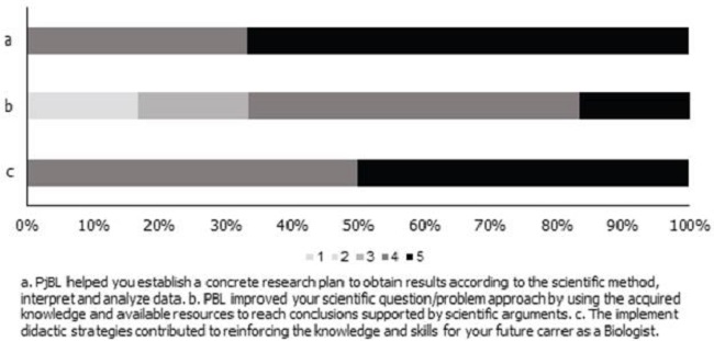 The focus group felt that the three didactics implemented impacted positively its meaningful learning (Figure 3) on the Likert scale. The total of students marked 4 and 5 when referring to the reinforcement of knowledge and skills from the three didactics (Figure 3). Similarly, the G3 perceived gamification as engaging (70-77 % scores of 4 and 5) and functional when learning microbiology concepts, procedures, and interpreting results (Figure 4). The focus group agreed that gamification is indirectly related to the cognitive, praxeological, metacognitive, communicative, and attitudinal components, hence improving their engagement with Microbiology learning (Figure 5). Also, the group pointed out that gamification, together with PBL and PjBL, reinforces what is learned in class and the laboratory. Therefore, through the complementarity of teaching strategies a meaningful learning experience can be achieved. G3's perception of the complementarity provided by gamification supports these findings (Figure 6).
