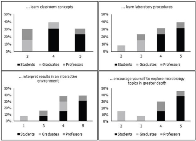 Similarly, the external participants (G3), composed of students, graduates, and professors from eight different higher education institutions, valued the audiovisual quality of the multimedia tutorials and games used in gamification, as well as the engagement that resulted from the games (Q3, Table 4). Overall, the participants gave high scores (≥4) to the audiovisual aspects and content quality of the games as well as the contribution to the cognitive (≥4.2) and metacognitive (≥4) components. Significant differences were revealed by the general assessment among students (P=0.01, Kruskall-Wallis test), graduates (P=0.005, Kruskall-Wallis test), and professors (P=0.01, Kruskall-Wallis test). The latter group rated the effect of gamification on engagement and its contribution to microbiology learning more positively, followed by undergraduates and graduates (Figure 2).