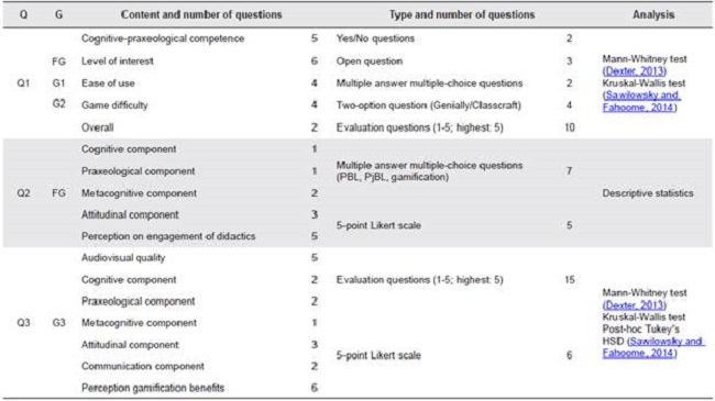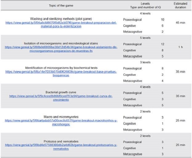 Another online structured questionnaire (Q3) from Google Forms with 21 items was completed by the G3, in which they rated on a scale of 1 to 5 (5 being the highest score) the audiovisual quality and contribution to the different learning competencies of gamification, after playing the six games (Table 1). Participants also indicated how interested they were in the subject of microbiology using a 5-point Likert scale (Joshi et a!.. 2015). Both questionnaires are described in Table 2.