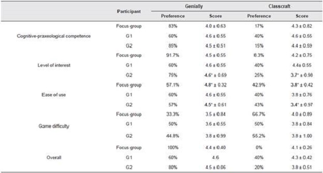 In order to choose one of the online gamification platforms, a pilot test was carried out with the focus group, Gl professors and their students (G2). After contemplating the four aspects of the questionnaire (Ql), 100% of the focus group showed a preference for Genially, as well as 60% of the professors and 80% of the external students. The numerical assessment (1-5) privileged Genially in the "cognitive-praxeological competence", "level of interest" and "ease of use" categories (Table 3). Genially's main advantage over Classcraft was exhibited in the "level of interest", where its evaluation was significantly different in the G2 (P=0.0046, Mann-Whitney test), and in the "ease of use", finding significant differences in the focal group (P=0.004, Mann-Whitney test) and in the G2 (P=0.0006, Mann-Whitney test). Regarding the negative aspect "Game difficulty", Classcraft obtained a higher score (Table 3), mainly associated with understanding the platform interface and following instructions.