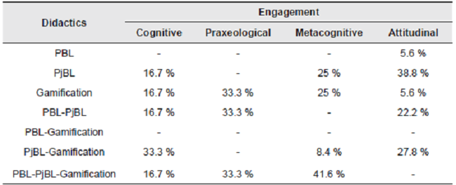 As stated by the focus group, Figure 1 and Table 5 (Annexes) show the most influential didactics or combination of didactics on student engagement. Cognitive reinforcement was attributed to gamification 66.7% of the time (gamification 16.7%, PjBL-gamification 33.3%, PBL-PjBL-gamification 16.7%). In terms of praxeological skills, the benefits were perceived to be the same for all three didactics (66.6%). Students also identified that gamification (75%) and PjBL (75%) improved their metacognitive learning. Finally, gamification was rated as the second didactics that positively influenced their attitude toward studying microbiology. It is noteworthy that in most cases, the focus group considered that combining two or three didactics allowed for a more comprehensive engagement and thus facilitated the development of each component. However, gamification stood out as the only didactic approach that by itself had a positive effect on all four engagement components.