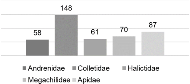 Según la Organización de las Naciones Unidas para la Alimentación y la Agricultura (ONUAA, 2021) "algunos polinizadores como las abejas, las aves y los murciélagos inciden en el 35% de la producción agrícola mundial, elevando la producción de 87 de los principales cultivos alimentarios del mundo y de muchos medicamentos derivados de las plantas". Por otra parte, a continuación, se presenta la cifra de especies según estudios realizados por familia de abejas en Chile, en la Figura 1. A la vez, la ONUAA (2020) identificó a 10 países que presentan un mayor consumo diario de miel en gramos por persona, siendo los países que más consumen miel: la República Central Africana (9,62 g/día), Nueva Zelanda (5,55 g/día), Eslovenia (4,4 g/día), Grecia (4,24 g/día), Suiza (3.87 g/día), Austria (3,62 g/día), Turquía (3,33 g/día), Ucrania (3,15 g/día), Eslovaquia (3,02 g/día) y Montenegro (3,03 g/día).