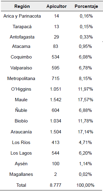 Y, el Registro Apícola (RA) de mayo 2021, senala que el número de apicultores inscritos a nivel nacional es de 8.777, en donde, las regiones de Chile que presentan la mayor cantidad de apicultores son Maule (1.542), Araucanía (l.504), O>Higgins (1.051) y Biobío (1.034). En la Tabla 1 se puede observar el total de apicultores a nivel nacional.
